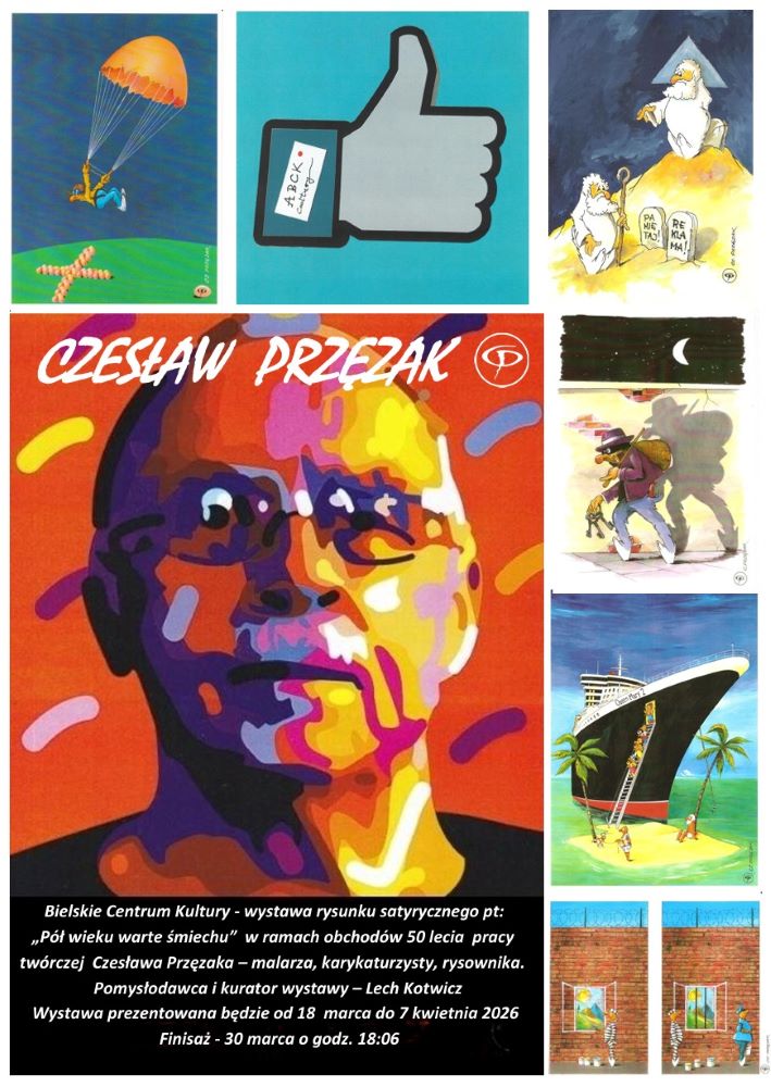 W dniach od 18 marca do 7 kwietnia w Bielskim Centrum Kultury im. Marii Koterbskiej na zaproszenie Lecha Kotwicza będzie prezentowana wystawa prac Czesława Przęzaka, która została zatytułowana „Pół wieku warte śmiechu”, a wpisana została w cykl 4 wystaw zorganizowanych w ramach obchodów jego 50 lecia pracy artystycznej artysty.