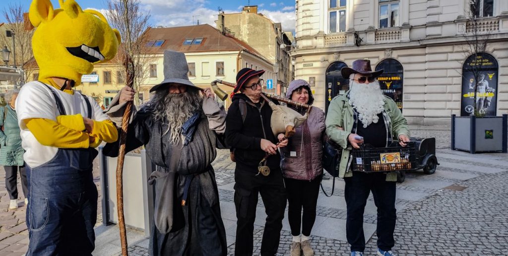 Co ciekawe, wręczaliśmy zaskoczonym przechodniom rysunki, których autorem był Czesław Przęzak, szczęśliwym trafem teleportowany do B-B z Wrocławia. Były dudy żywieckie, do których przyczepiony był otworem paszczowym jegomość w charakterystycznym góralskim kapelutku, a na początku spaceru mile nas zaskoczył Dominik Czuż.